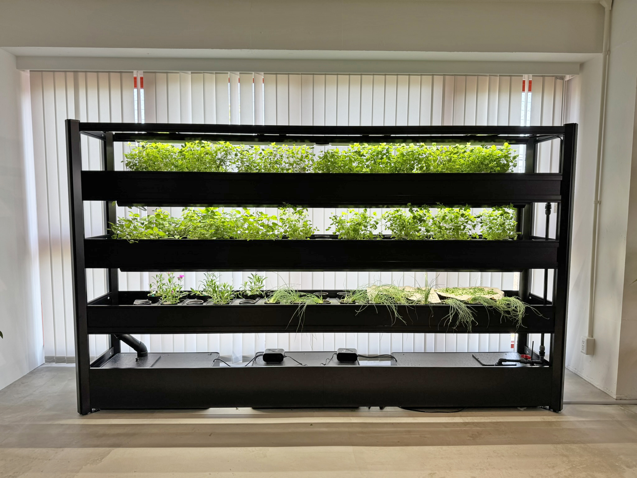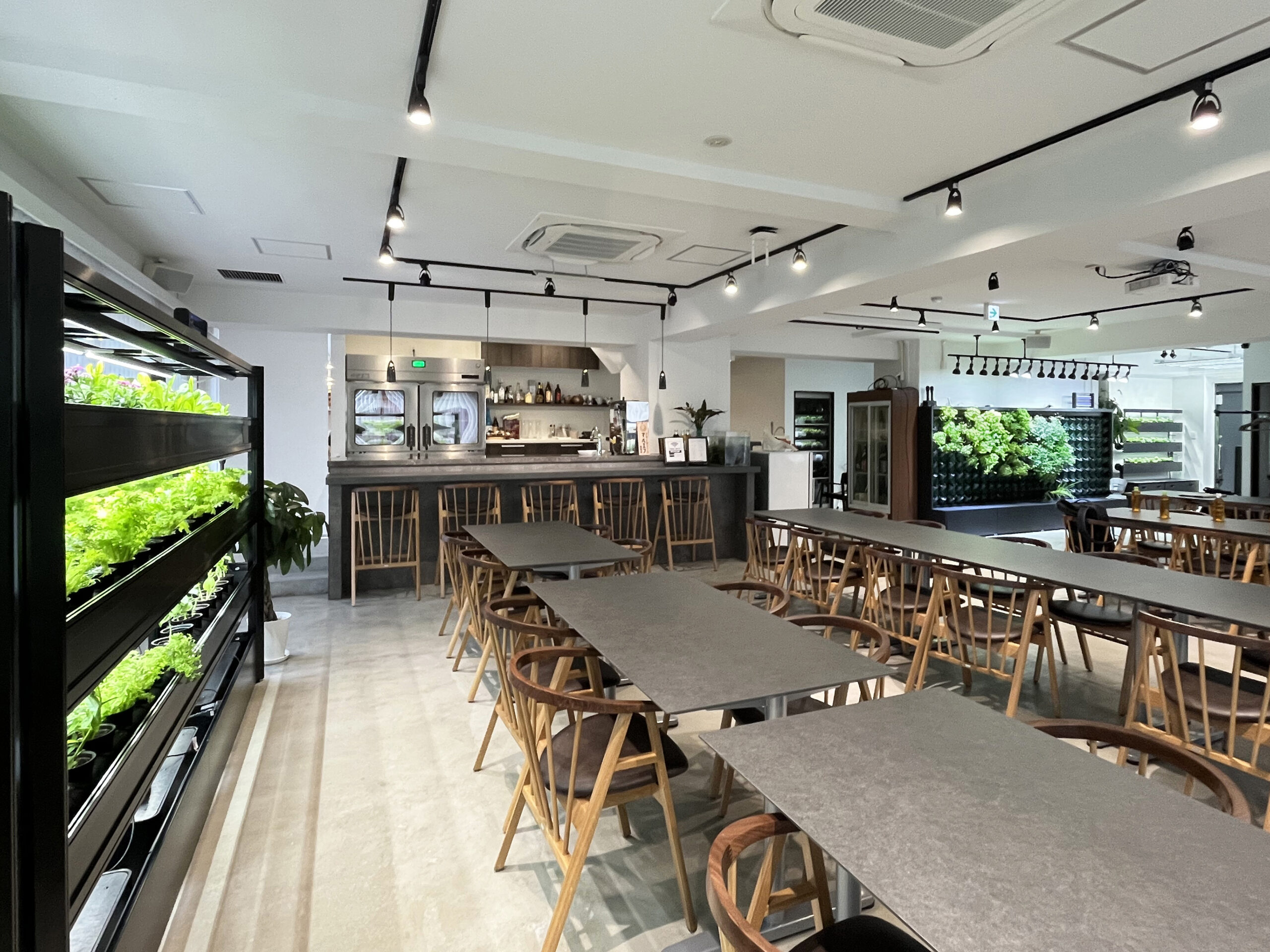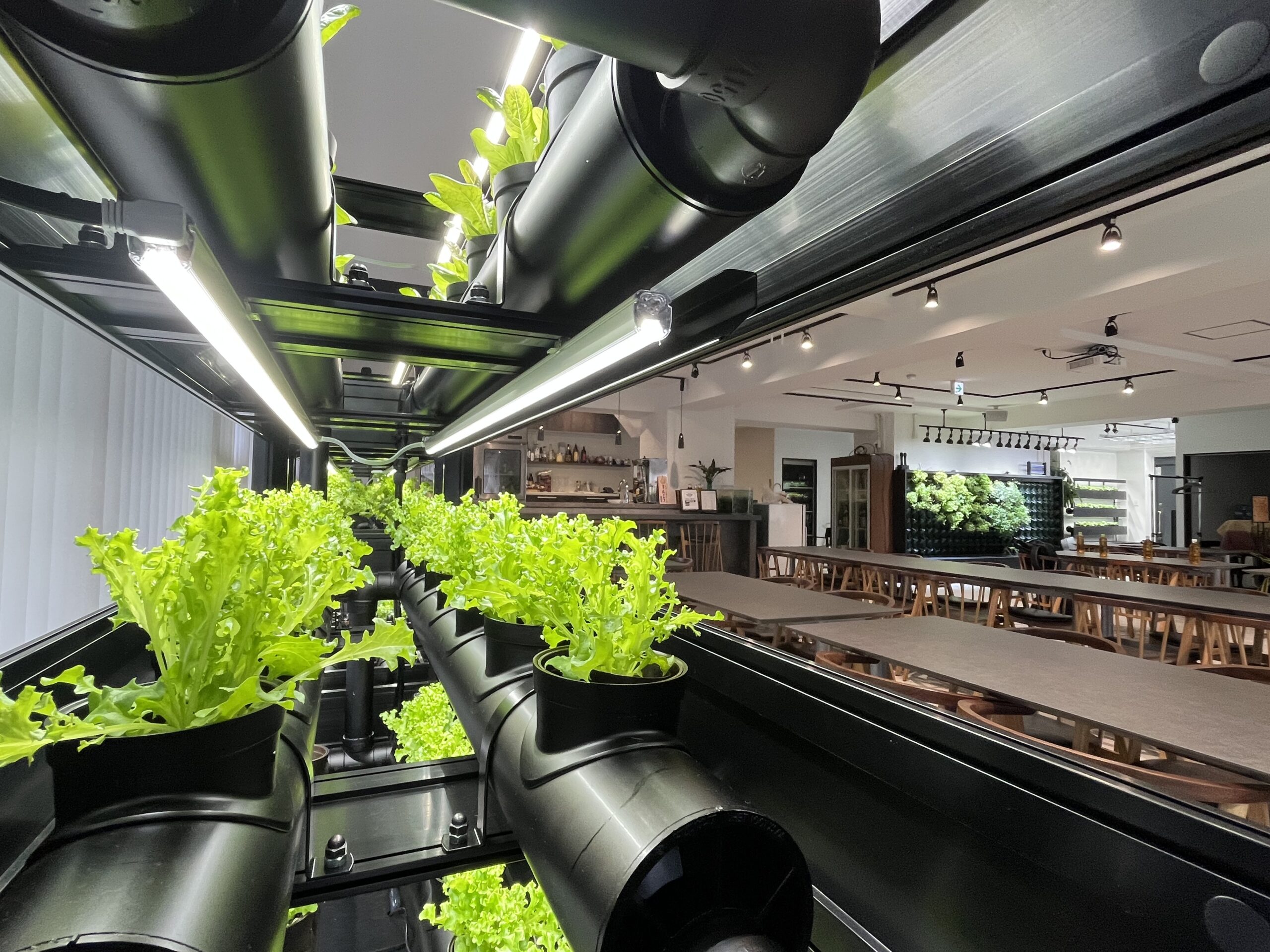 飲食スペースをL字に囲うように、みどりコネクトをベースにした、多段式の栽培ユニットが設置されています。