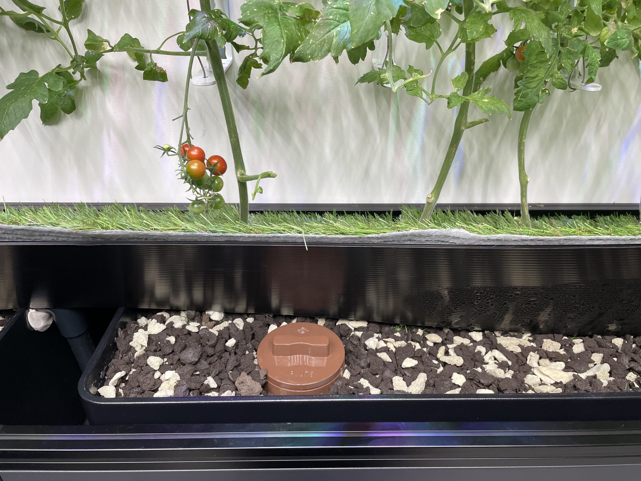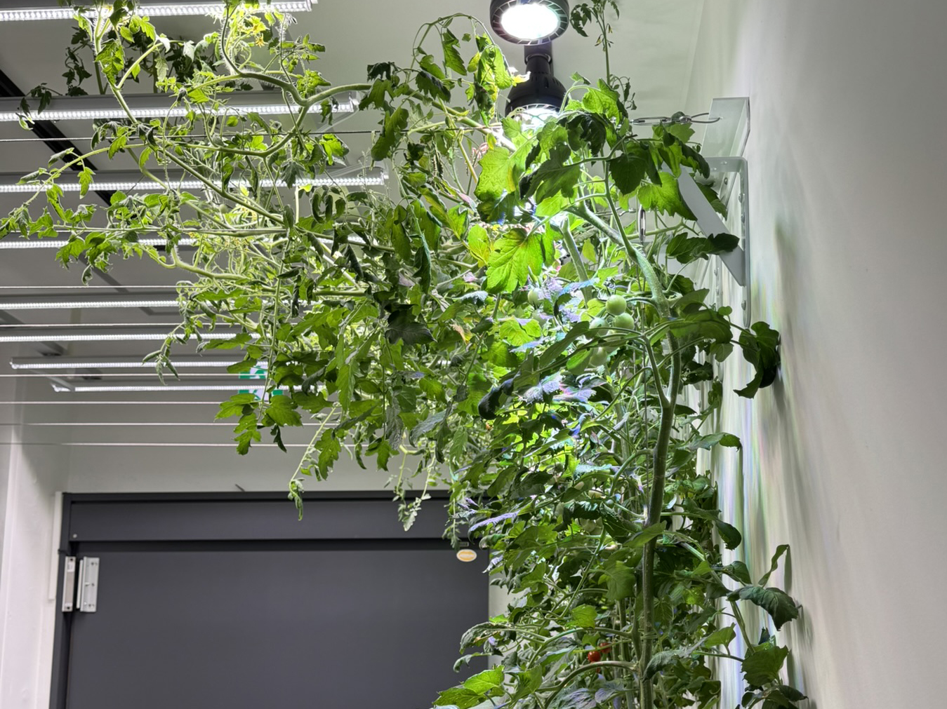 入り口を入ると片側には、トマトを栽培している什器があります。
