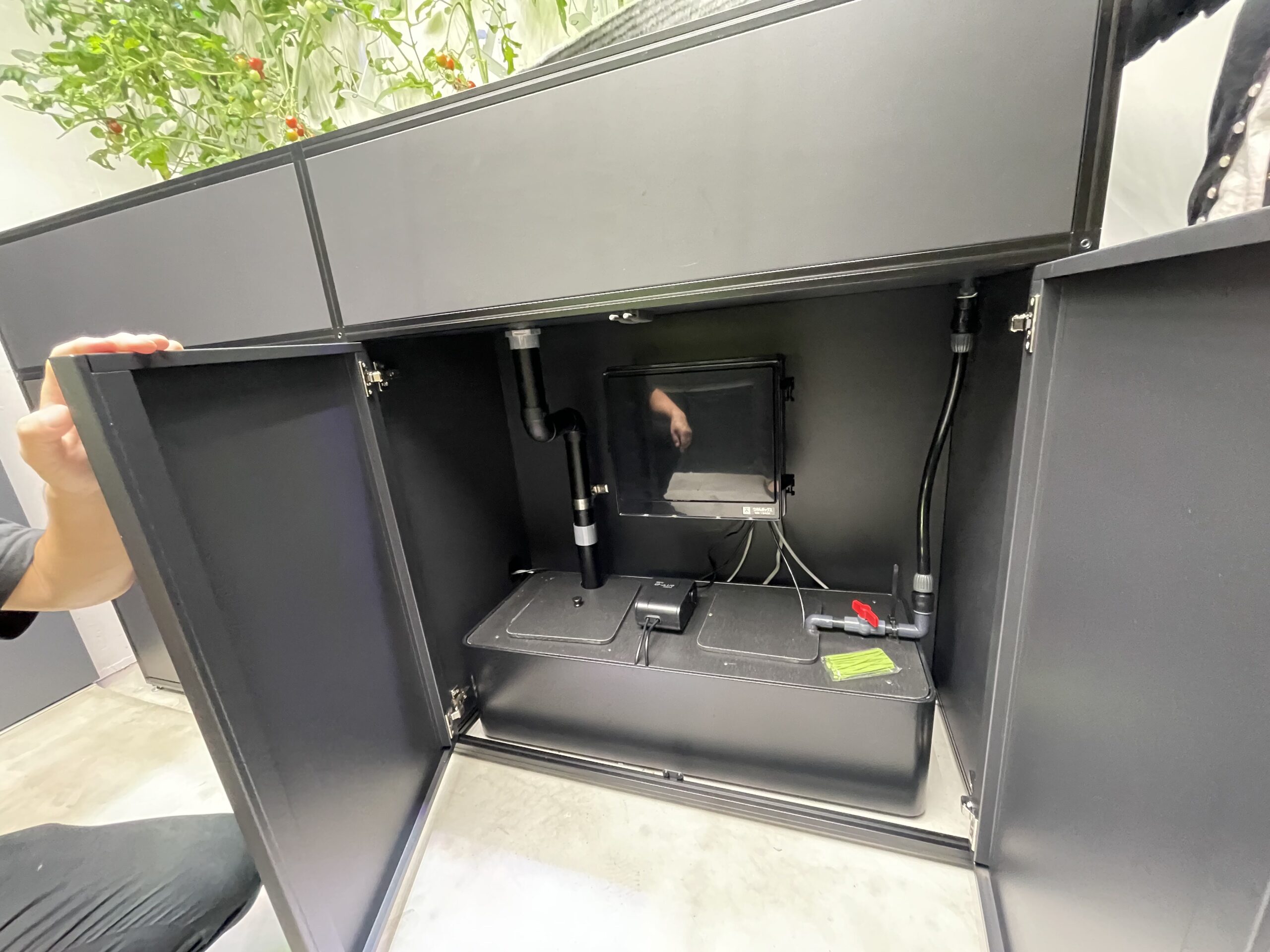 キャビネットの中には、給排水管とタンク・ポンプといった自動潅水設備が収納されています。