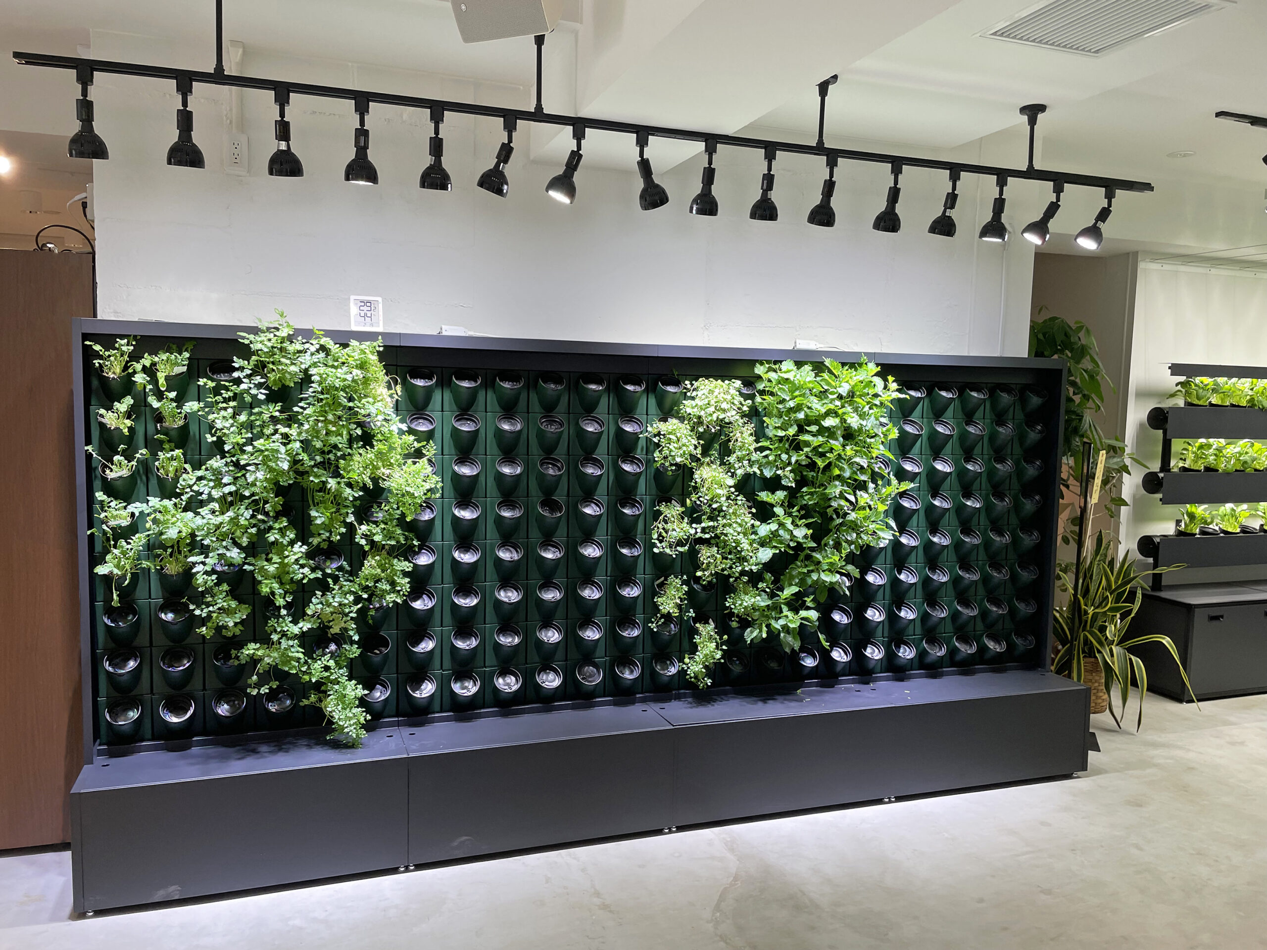 建物の中央にある壁と、窓側にある壁面には、みどりスタックによる壁面栽培設備が設置されています。