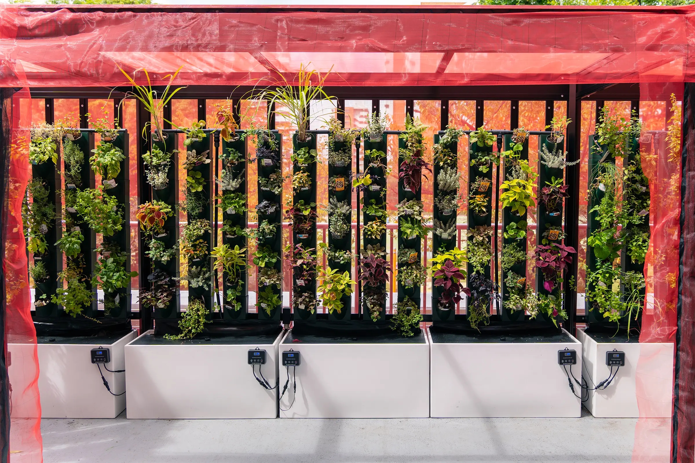 アルミ製のパーゴラの中に、柱状のみどりスタックが4本と給水タンクがセットになったものが、コの字上に7台構成されています。