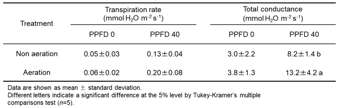 光合成蒸散計測システムを用いて経時的に計測し,異なる培地の通気条件が光合成蒸散に及ぼす影響の解析を行った結果(表2),葉面積と暗呼吸速度は処理区間で有意差はありませんでした。PPFD 40 µmol photos m-2s-1における純光合成速度は無通気区に比べて通気区が30%高くなっています。蒸散速度,総コンダクタンスについて,PPFD 40 µmol photos m-2s-1における総コンダクタンスは無通気区に比べ通気区で35%高いが,そのほかの場合には明確な差異はありませんでした。このことは,培地通気処理は観葉植物の生長に悪影響を与えることがなく,根圏の酸素供給が改善され,生育が促進されることを示しています。