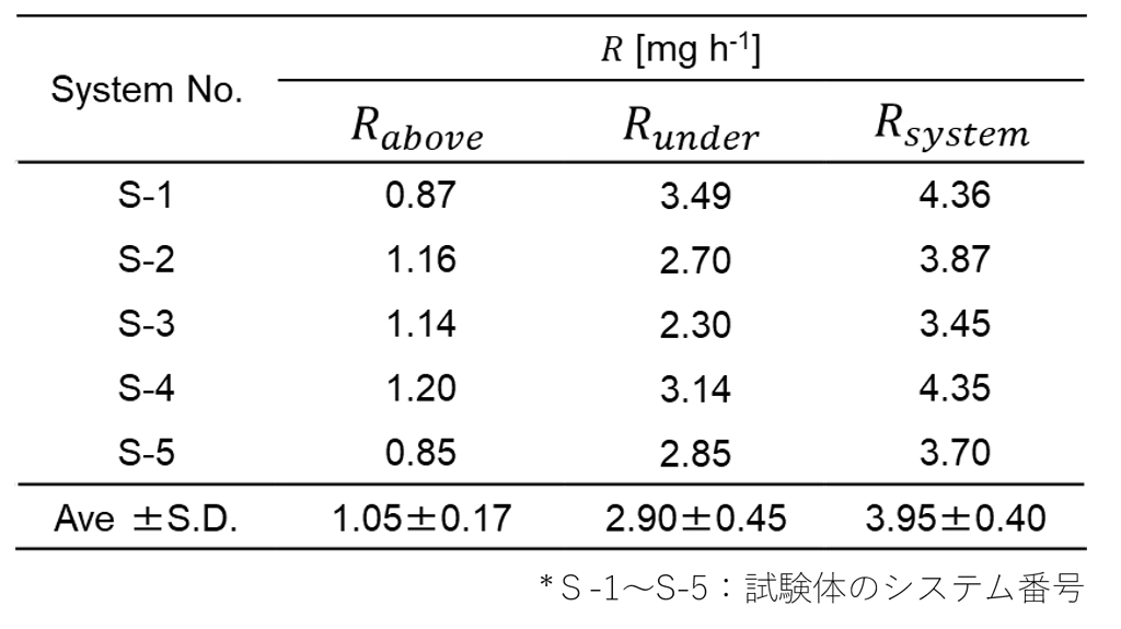 ここで,R_systemは土壌通気条件下でシステムの全除去能,R_aboveは無通気条件下で植物の地上部による除去能,R_underは土壌通気条件下で植物の地下部による除去能です。S-1~5の地下部 (R_under)による除去能の平均値は2.90±0.45㎥h⁻¹,地上部 (R_above) の1.05±0.17㎥h⁻¹に比べて2.8倍に達し,システム全体の約73%を占めています(表3)。